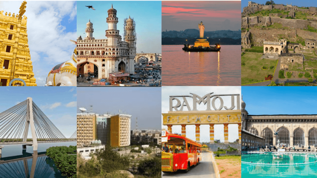 Charminar, Salarjung Museum, Chowmahalla Palace, Nehru Zoological Park, Golconda Fort, Birla Mandir, Hussain Sagar Lake, NTR Garden